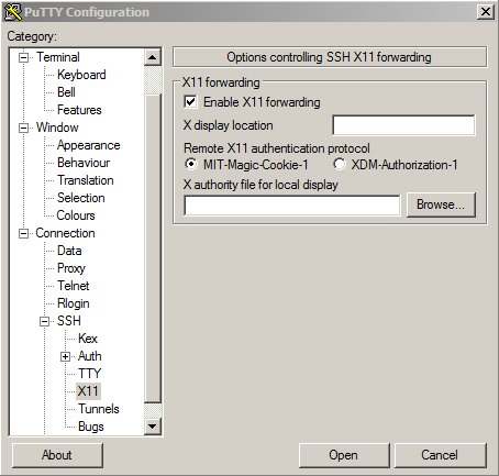 Launch PuTTY, click on the plus sign to the left of “SSH” in the left hand pane, then click “X11” and check the box labelled “Enable X11 Forwarding”.